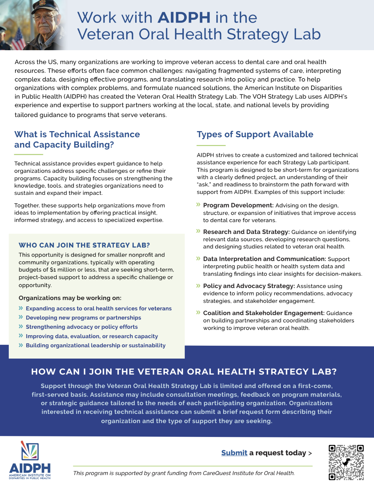 AIDPH is thrilled to launch our newest technical assistance and capacity-building program: The Veteran Oral Health Strategy Lab. The VOH Strategy Lab offers complimentary technical assistance to organizations with a clearly defined project, an understanding of their “ask,” and readiness to brainstorm the path forward with support from AIDPH. This opportunity is designed for smaller nonprofit and community organizations, typically with operating budgets of $1 million or less, that are seeking short-term, project-based support to address a specific challenge or opportunity.