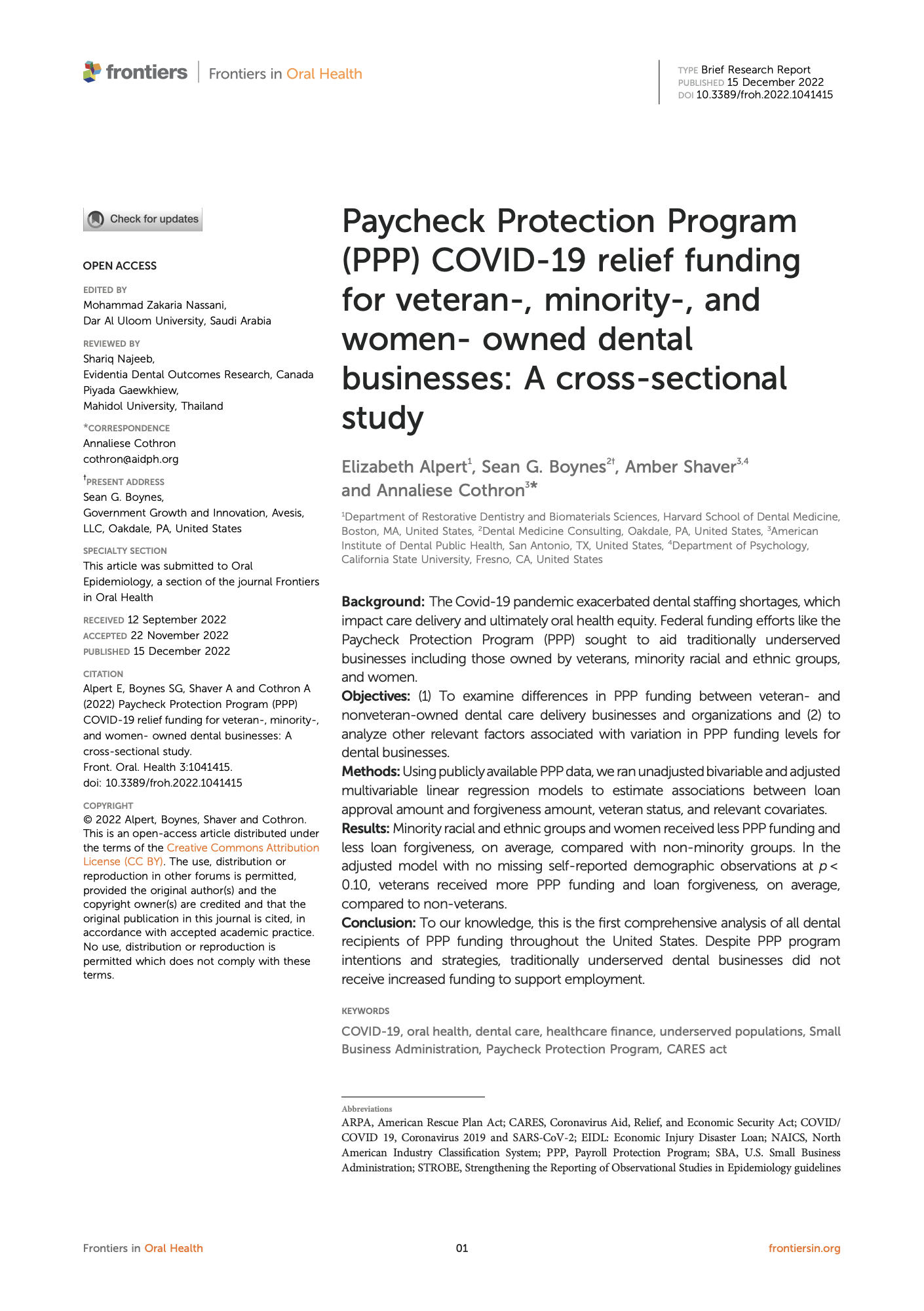 The Covid-19 pandemic exacerbated dental staffing shortages, which impact care delivery and ultimately oral health equity. Federal funding programs such as the Paycheck Protection Program (PPP) were intended to help underserved businesses that experienced revenue shortfalls due to government shutdowns, including those owned by veterans, minority-owned traditional groups, and women. Data analyzed by AIDPH revealed that minority racial and ethnic groups and women received less PPP funding and less loan forgiveness, on average, compared with non-minority groups.